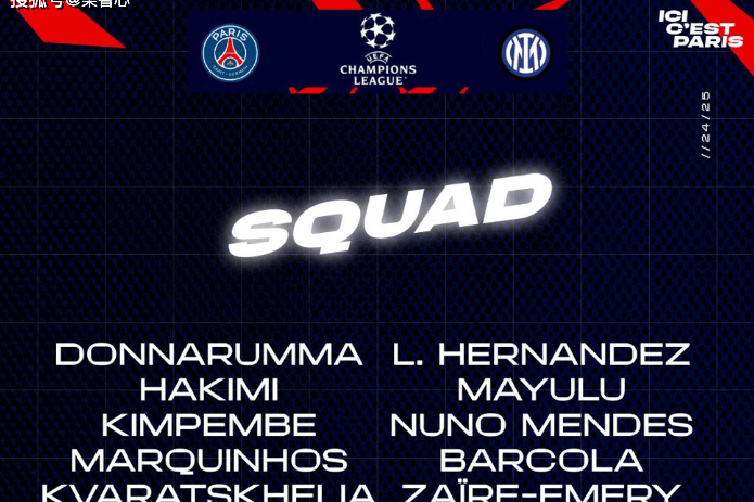 中场:维蒂尼亚、李刚仁、法比安-鲁伊斯、若昂-内维斯、马尤卢、扎伊尔-埃梅里